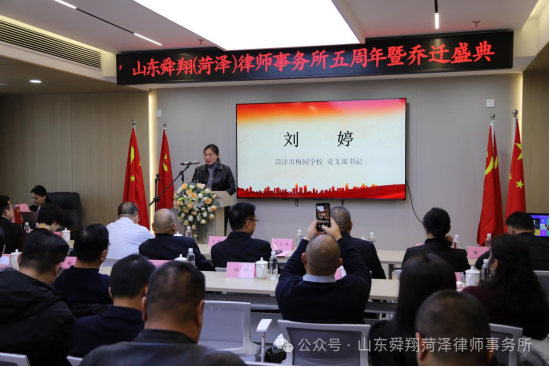 庆典现场,菏泽市梅园学校党支部书记刘婷代表全校师生向舜翔菏泽律所送上诚挚祝福。刘书记在致辞中特别提到,梅园学校与舜翔律所的合作,是“法治教育与心理关怀深度融合的生动实践”——韩光玲律师团队凭借“法律+心理”的复合专业优势,为校园普法和纠纷调解注入新动能:法治课堂“入脑入心”。朱永华副主任“以法服人、以情动人”的调解,为平安校园建设提供了坚实保障。刘书记表示:“期待未来与舜翔律所在更广领域深化合作,共同为青少年成长撑起法治晴空。”