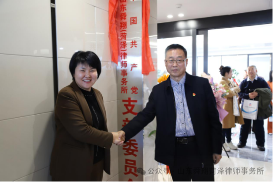 上午10时18分,庆典进入高潮——揭牌仪式。在全体嘉宾的见证下,菏泽市律师行业党委副书记陈会领、舜翔菏泽律所主任韩光玲共同为“山东舜翔(菏泽)律师事务所党支部委员会”揭牌;随后,菏泽市新联会常务副会长袁绍飞、律所副主任朱永华共同为“山东舜翔(菏泽)律师事务所”新址揭牌。
