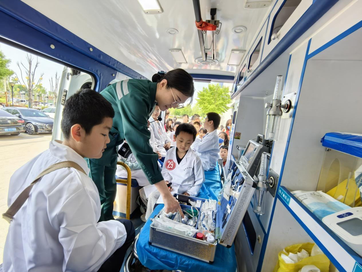 活动伊始,孩子们满怀好奇地来到急诊医学科。在医护人员的引导下,大家首先近距离参观了120急救车。医护人员详细讲解了急救车的功能分区,并逐一介绍了车内配备的车载监护仪、除颤仪、呼吸机、供氧系统等各类急救医疗设备,生动地将急救车比喻为“车轮上的ICU”或“移动的急诊室”。通过讲解,孩子们不仅认识了这些“救命神器”,更深刻理解了急救人员争分夺秒、守护生命的神圣使命。