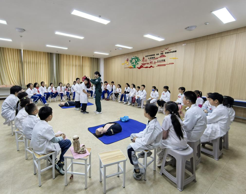 活动的压轴戏,医务人员用模拟人演示了海姆立克急救法与心肺复苏术。急诊医学科老师现场教学和手把手演示,用通俗易懂的语言为孩子们讲解了操作要点,指导学生们实操练习。孩子们积极参加,认真倾听,积极互动,在实践中增长见识,在体验中收获成长。